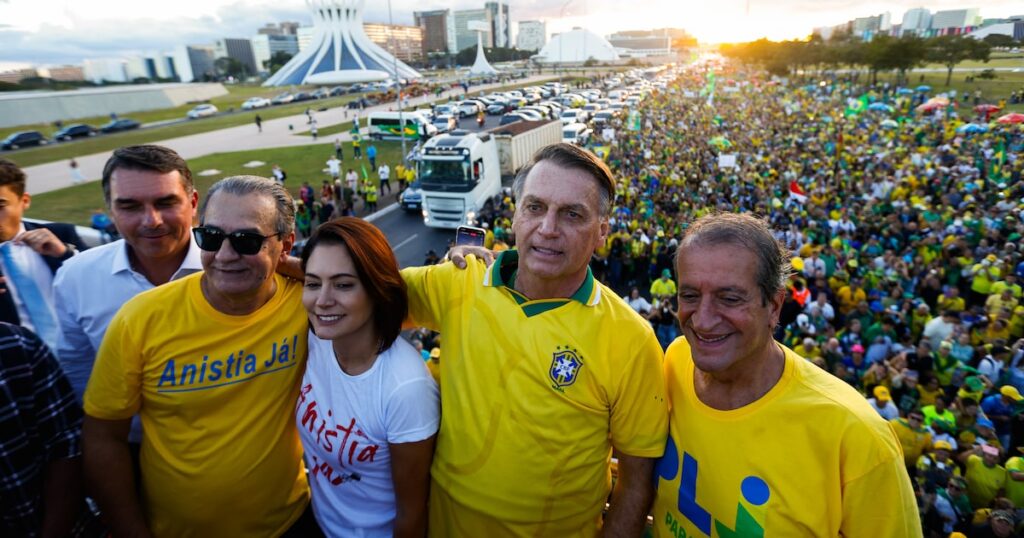Jair Bolsonaro junto de familiares e aliados em ato pró-anistia em Brasília Foto: WILTON JUNIOR