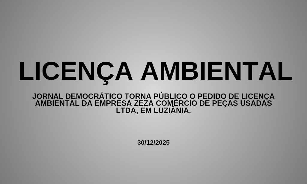 Jornal Democrático torna público o pedido de licença ambiental da empresa ZEZA Comércio de Peças Usadas Ltda, em Luziânia