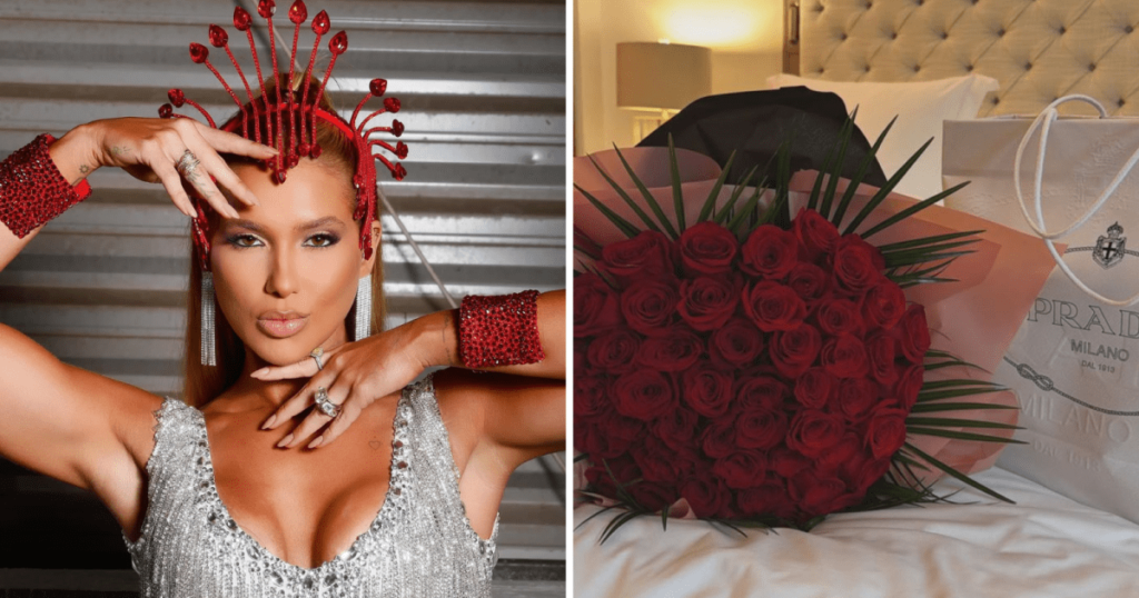 Mais cedo, ela já havia mostrado outro buquê de rosas vermelhas de tamanho menor que veio acompanhado de um bilhete assinado por uma mulher chamada Flávia.